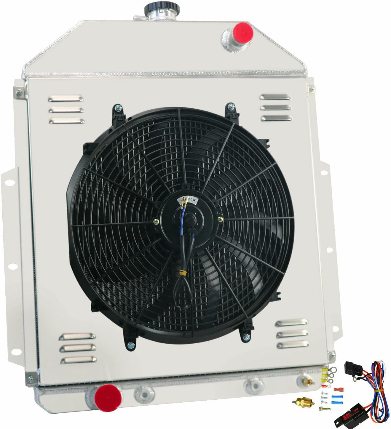 Fitment: For Ford 1 Ton Pickup 1 Ton -- 1945-1947 For Ford 1 Ton Pickup Base 2.0L l4 GAS 1942/Base 3.7L l6 GAS 1942,1946-1947 For Ford 1 Ton Pickup Base 3.6L/3.9L V8 GAS 1942-1947 For Ford 1/2 Ton Pickup 1/2 Ton -- 1945-1947 For Ford 1/2 Ton Pickup Base 2.0L l4 GAS 1942 For Ford 1/2 Ton Pickup Base 3.6L/3.9L V8 GAS 1942-1947 For Ford 1/2 Ton Pickup Base 3.7L l6 GAS 1942,1946-1947 For Ford 3/4 Ton Pickup Base 2.0L l4 GAS 1942 For Ford 3/4 Ton Pickup Base 3.6L/3.9L V8 GAS 1942-1947 For Ford 3/4 Ton Pickup Base 3.7L l6 GAS 1942,1946-1947 For Ford F1/F2/F3/F4 Base 3.5L l6 GAS 1951-1952 For Ford F1/F2/F3/F4 Base 3.7L l6 GAS 1949-1952 For Ford F1/F2/F3/F4 Base 3.9L V8 GAS 1949-1952 FAN SPEC: Maximum Fan CFM: 2000±200 Fan Diameter (in): 16.050 inches Thickness (in): 2.790 inches Number of Blades: 10 blades Maximum Fan RPM: 2,250 rpm Blade Material: Plastic Amp Draw: 12.70 amps Includes the Mounting Tabs for an Easy Zip Tie Installation Radiator Details: ROWS : 4 ROWS CORE Core Dimensions (H x W): 21 1/2" x 20 7/8" Overall Dimensions (H x W): 27 5/8" x 24 3/4" Hose Locations: IN: Passenger / OUT: Driver Hose Fittings: IN: 1 1/2" - OUT: 1 3/4" Trans Cooler Details: 1/2-20 Straight Thread, G 1/4 Mounting Type: BRACKET MOUNT Mounting Type: BRACKET MOUNT Mounting Style: Screw-On Relay Kit Instructions: RED + connect directly to battery. WHITE wire to ignition switch power source. BLACK goes to thermos switch. BLUE wire goes to the Fans. Thermostat Relay Kit: Activates by grounding electric fans at preset temperature. 180'F turn-on temperature, 165'F turn-off temperature. 3/8" NPT thread-in brass probe w/ 1/2" NPT adapter included. Probe typically threads into radiator, water outlet or manifold.